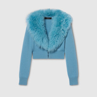 Introducing Spring Summer 2026. This style is inspired by the "La Sciura" look of La Famiglia. The collection reinterprets the House’s codes through singular personalities and distinctive aesthetic attitudes. Crafted from knit wool cashmere, this cardigan is enriched with a detachable soft long shearling collar. - Light blue knit wool cashmere - Rib trim - Double G embroidery - Detachable soft long shearling collar - Deep V-neckline - Hook closure - Cropped - Length: 16.9", based on a size XS - Made in Italy