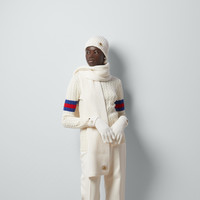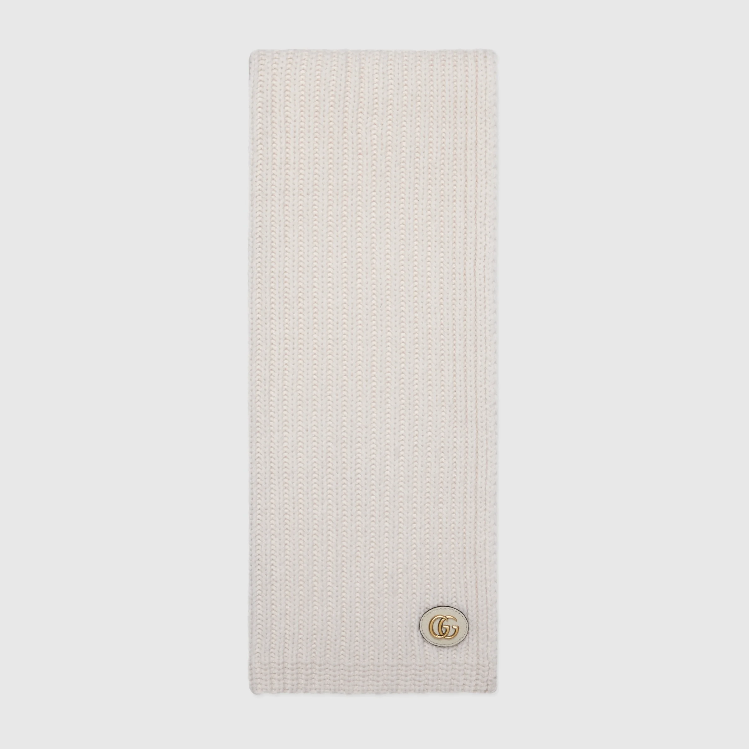 Presented in ivory, this scarf is crafted from rib knit wool cashmere. Originally inspired by a belt buckle from the 1970s, the Double G defines the accessory as a leather patch detail. - Ivory knit rib wool cashmere - Oval Double G leather patch - 9.8"W x 70.9"L - Made in Italy