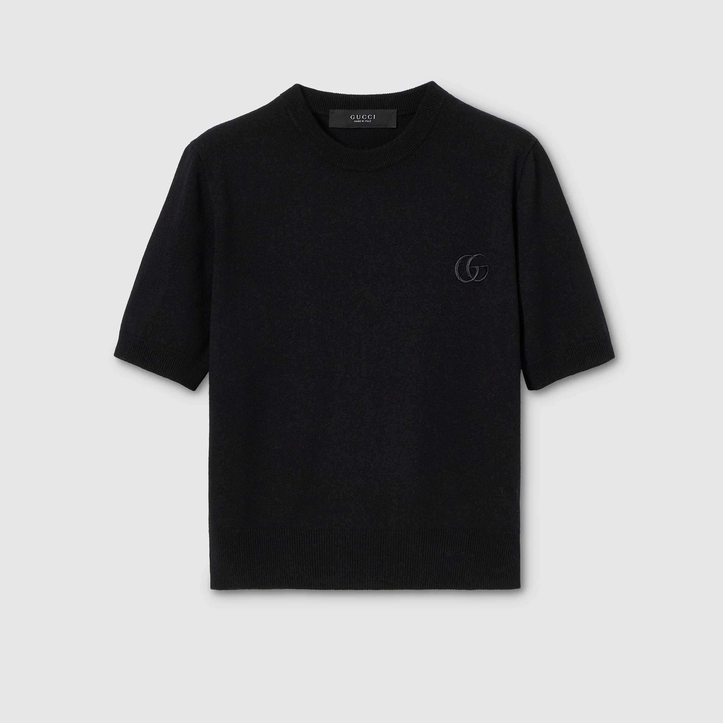 Introducing Spring Summer 2026. This style is inspired by the "Incazzata" look of La Famiglia. The collection reinterprets the House’s codes through singular personalities and distinctive aesthetic attitudes. Crafted from carded knit wool, this top is enriched with a Double G embroidery. - Black fine carded knit wool - Rib trim - Double G embroidery - Crewneck - Short sleeves - Length: 20.1", based on a size XS - Made in Italy - Fabric: 100% Wool - Embroidery: 100% Polyester