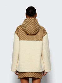 Details - White and camel GG intarsia wool fleece jacket - Lined - Fixed hood with drawstring closure - Dropped shoulder - Wide sleeves - Two side pockets - Zip closure - Oversized fit - Model is 5'9"/175cm and is wearing a size S - Fabric: 80% Wool, 20% Polyester - Fabric: 70% Cotton, 30% Polyester - Lining: 100% Polyamide - Padding (fiber): 100% Polyester Brand Style: 798503 XJGSI Designer/Brand: GUCCI