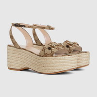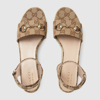A refined blend of heritage and modernity, this design showcases the brand's signature craftsmanship. Designed in the original GG canvas, this timeless piece celebrates Gucci’s style with a twist. The classic espadrille silhouette is elevated by the polished Horsebit detail. - Beige and dark brown Original GG - Women's - Light gold-toned hardware - Leather lining - Horsebit - Cord covered flatform - Adjustable ankle strap with buckle - Mid-heel - Height: 2.9" - Made in Spain