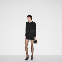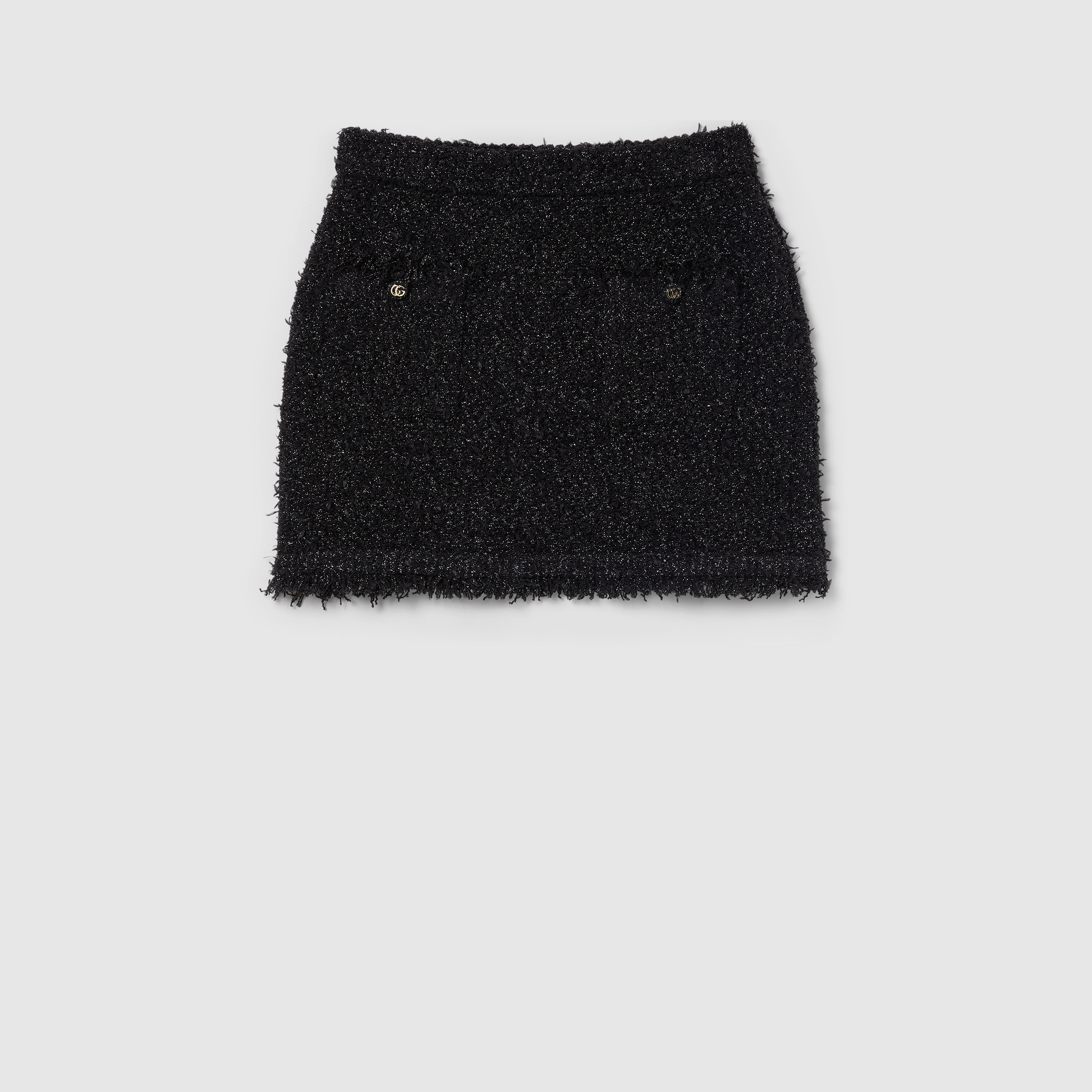 Fringes, beads, crystals and other highly artisanal details characterize Creative Director Sabato De Sarno's approach to the everyday wardrobe, expressed through inspirations and distinctive codes. This mini skirt has been crafted from a chunky lame and viscose woven-effect stitch and enriched with self-covered buttons with Double G. - Black chunky lame and viscose woven-effect stitch - Self-covered buttons with Double G - Unlined - Two front pockets with silver Double G detail - Fringe trim - Hidden zip closure - Mini - Length: 13.8"; based on a size XS - Made in Italy - The product shown in this image is a size extra small