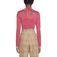 For Ouverture, Alessandro Michele explores a variety of possibilities, translating the concept onto fabrics and silhouettes to present new purposes and ways of dressing. Here, the pink sweater is reimagined with a lamé blend for a refined feel. - Pink lamé viscose - High neck - Self-tie neck bow at the back - Ribbed cuffs and bottom - Length: 20.6" based on a size small - Made in Italy - The model is 5'7" tall. The product shown in this image is a size small