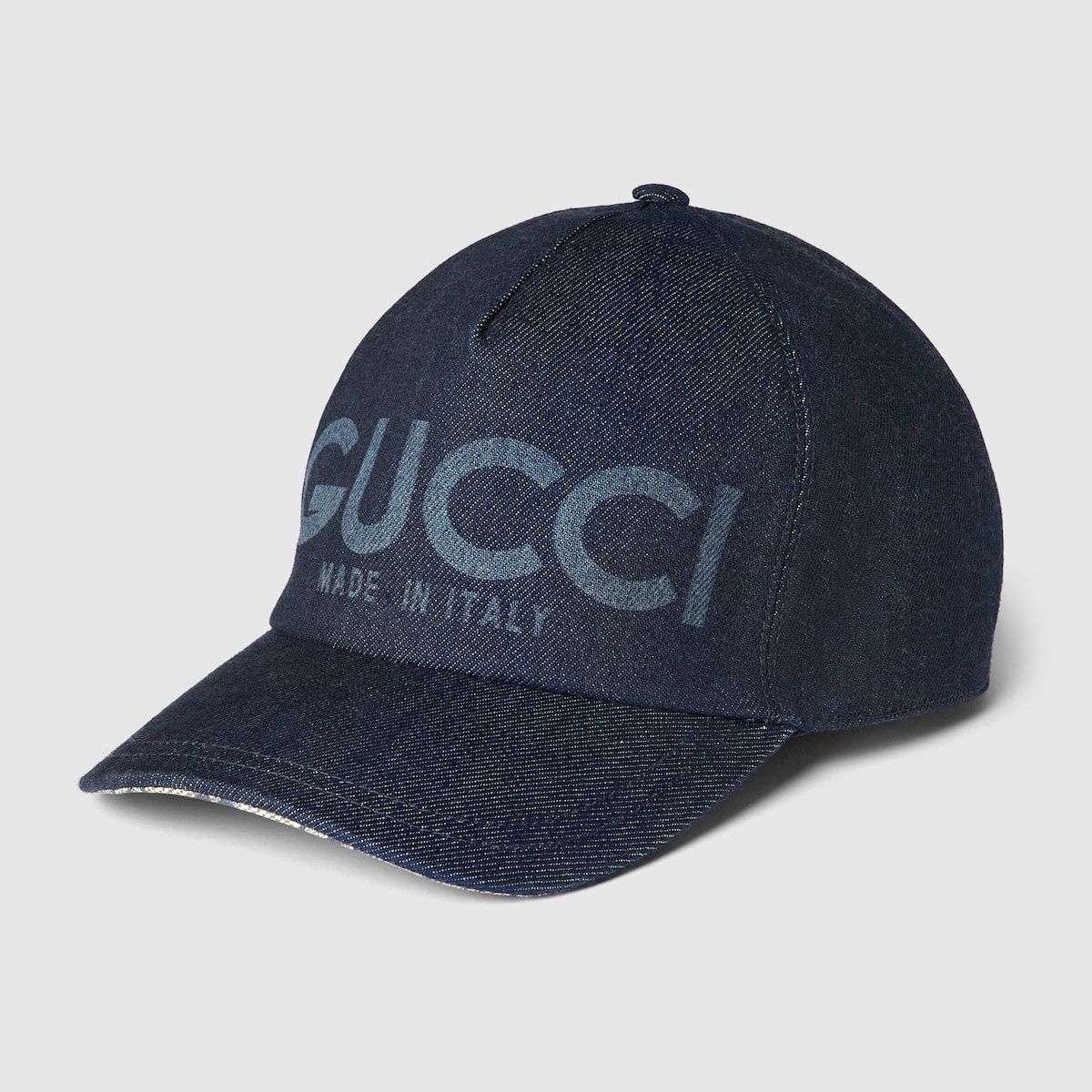 A selection of soft accessories appears in denim to welcome the new season. Heritage symbols and emblematic motifs of the House decorate hairbands and bucket hats with a modern touch. Crafted from a dark blue denim, this baseball hat reveals a Gucci Made In Italy script and a GG Supreme canvas lining. - Dark blue denim - Lasered Gucci Made In Italy script - GG Supreme canvas lining - Adjustable hook and loop closure - Made in Italy