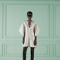 Shiny and reflective fabrics inspired by the '80s recall the idea of Metamorphosis and the dilemma of what is and what should become. Part of the selection, this ivory leaf lamé jacquard dress is further enriched with a crystal embroidery and special details such as the cut-out neckline and open sleeves. - Ivory leaf lamé jacquard - Crystal embroidery - Lined - Cut-out neckline - Open sleeves - Zip closure - Length: 29.5" based on a size 40 (IT) - Made in Italy - The product shown in this image is a size 40 (IT)