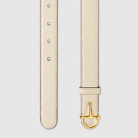 Gucci Half Horsebit offers a contemporary take on one of the House’s most emblematic codes, reimagining the signature hardware for the new season. Here it appears across a thin belt crafted from leather. - Ivory leather - Gold-toned hardware - Half-Horsebit buckle - 0.9" width - Made in Italy - Can be worn as a hip or waist belt. Sizing will differ based on where the belt is worn, please refer to the size guide to find your size.