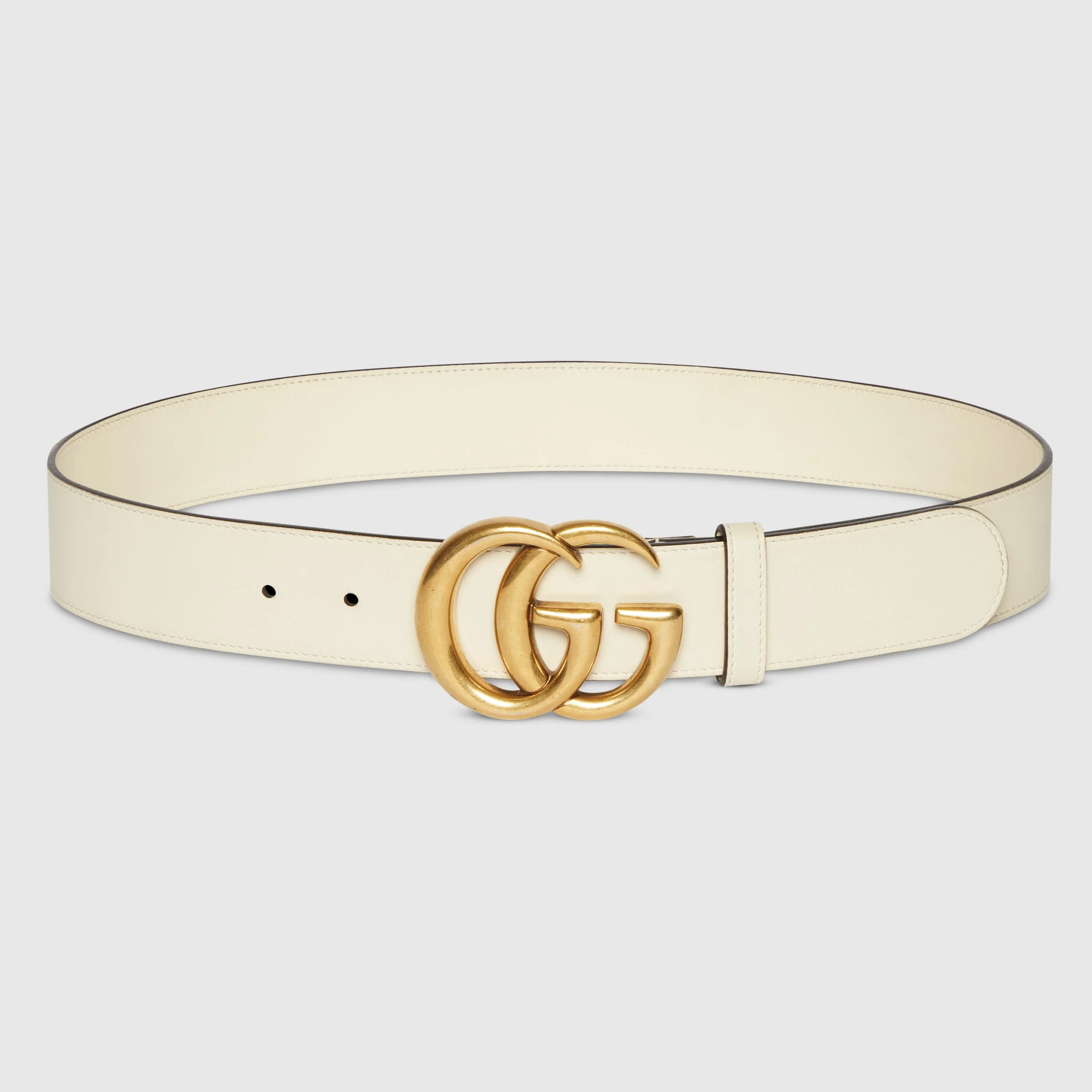 Inspired by an archival design, the Double G emblem is crafted from brass hardware with an antiqued finish. Placed on a smooth white leather belt. - White leather - Antiqued brass hardware with a shiny finish - Double G buckle - Buckle: 3"W x 2.4"H - 1.5" belt width - Made in Italy - Can be worn as a hip or waist belt. Sizing will differ based on where the belt is worn, please refer to the size guide to find your size.