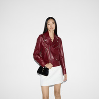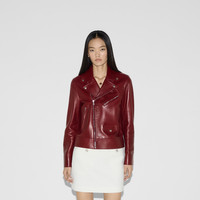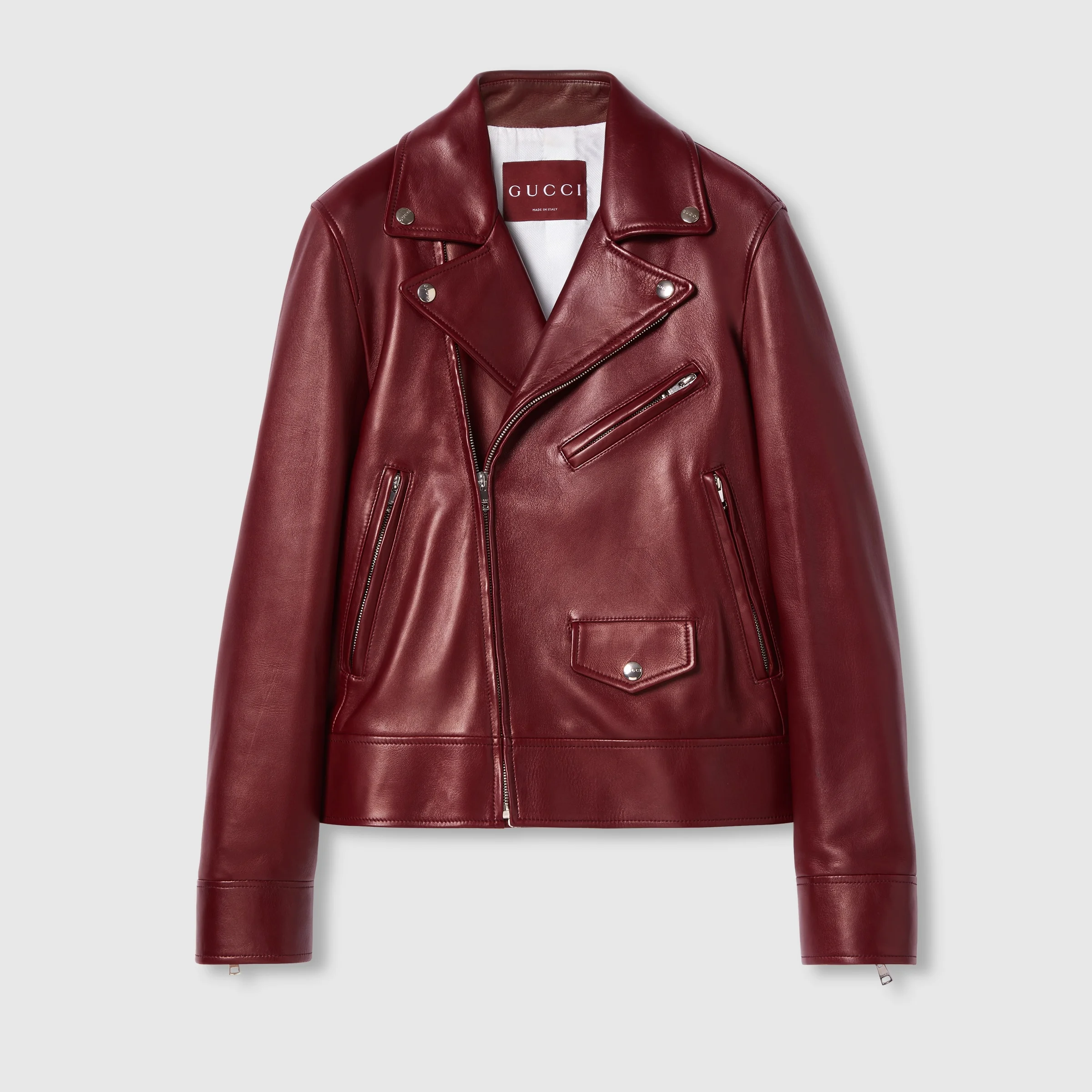 The Cruise 2025 palette continues to feature the House's signature red hue, Gucci Rosso Ancora, which distinguishes the ready-to-wear pieces from sporty jersey models to leather and mini dresses. This biker jacket is presented in a soft leather with zip details. - Gucci Rosso Ancora red leather - Silver-toned metal snap buttons - Lined - Peak lapel - Long sleeves - Breast pocket - Front pocket - Two side pockets - Zip cuffs - Zip closure - Length: 21.7"; Shoulder: 16.5"; Sleeves length from center back: 33.1"; Hips: 24.8" based on a size 40 IT - Made in Italy - The product shown in this image is a size 40 (IT)