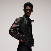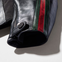 This style is part of the Gucci Primavera collection. Biker inspirations are reinterpreted with leather Web detail along the sleeves on this regular-fit jacket. Crafted from treated calf leather with subtly worn-out effect, the style features intentional creases for a lived-in appearance. Special finishings and a softened grain complete the distinctive design. - Black treated calf leather with worn-out effect - Stretch side inserts - Green and red Web leather detail at the sleeves - Tonal lining - Padded collar - Hidden snap buttons at the collar and cuffs - Zip closure at the cuffs - Front zip closure - Regular fit - Total length: 22.36"; Shoulder: 20.79"; Chest: 41.34"; Sleeves length: 24.65"; based on a size 48 (IT) - Made in Italy - Genuine leather: Calfskin - Genuine leather: Buffalo - Lining: 75% Acetate, 25% Cotton - Lining: 78% Polyamide, 18% Viscose, 4% Elastane - Lining: 100% Silk - Pocket lining: 100% Cotton