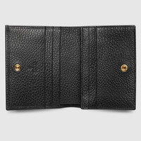 A card case wallet with small Double G metal detail. Made in textured leather. - Black metal-free tanned leather - Gold-toned hardware - Double G - Five card slots - One bill compartment - Interior zipper pocket - Snap closure - Open: 4.3" W x 6.9" H - Closed: 4.3" W x 3.3" H x 1.2" D - Made in Italy