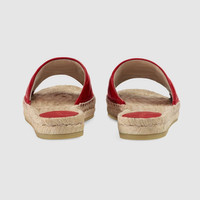 Carefully constructed in Spain, these espadrille sandals are made with hibiscus red leather and finished with the Double G. With an inherently seaside feel, the espadrille evolves from its 13th century origins into a contemporary style. - Hibiscus red matelassé leather - Double G - Cord platform - .8" platform - Materials made in Italy. Shoe constructed in Spain