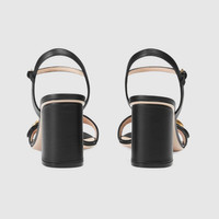 Recalling the GG Marmont handbag line, the Double G gold-toned hardware is set on the front strap of these mid-heel leather sandals. - Black leather - Adjustable ankle strap - Double G - Mid-heel - 3" heel - Made in Italy