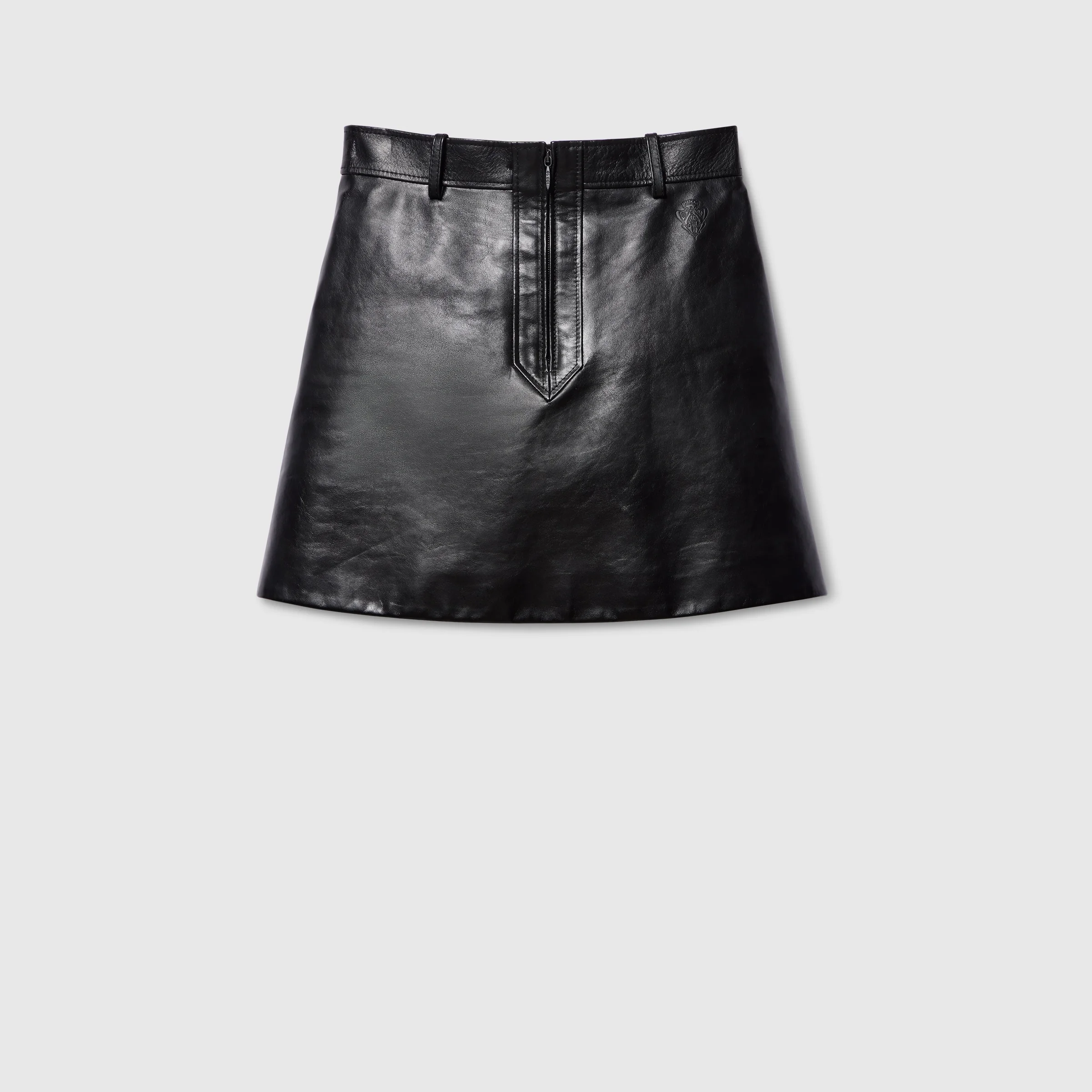 Introducing Spring Summer 2026. This style is featured as part of the "Incazzata" look of La Famiglia, which reinterprets the House’s codes through singular personalities and distinctive aesthetic attitudes. Crafted from leather, this skirt is enriched with an engraved Gucci zip puller. - Black leather - Engraved Gucci zip puller - Tonal lining - Belt loops - Front zip closure - Length: 15.74", based on a size 38(IT) - Made in Italy - Genuine leather: Cow leather - Lining: 75% Acetate, 25% Silk