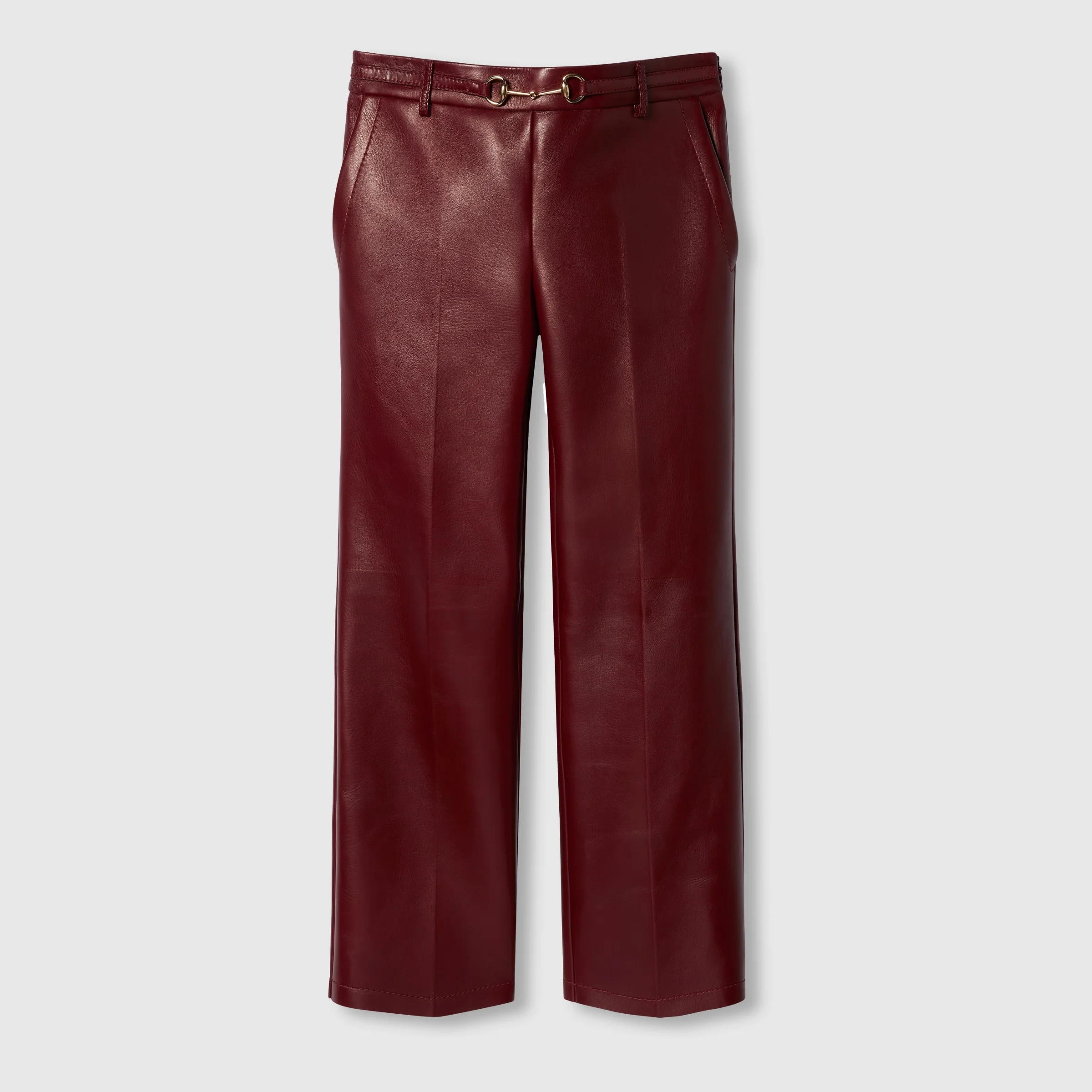 These pants are crafted from Gucci Rosso Ancora leather, in the red hue of the House. Designed with Horsebit hardware details at the waist, the style is completed with two side pockets and slit pockets at the back. - Gucci Rosso Ancora red leather - Lined - Horsebit hardware detail at the waist - Side pockets - Slit pockets at the back - Length: 36"; Hips: 36.2"; Waist: 31.1" based on a size 36 IT - Made in Italy - The model is 5'9" tall