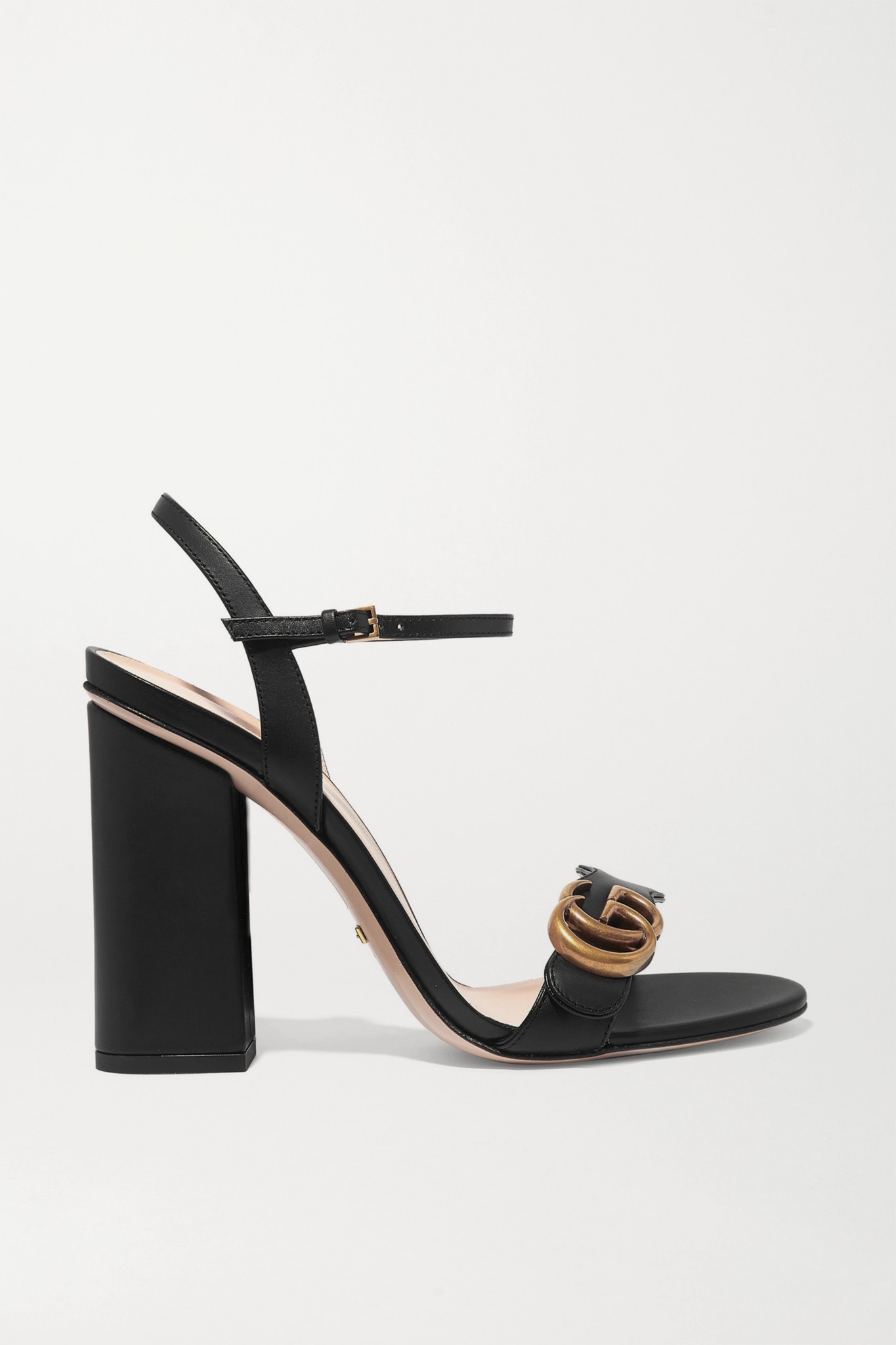 The Double G gold-toned hardware is set on the strap of these high-heel leather sandals. - Black leather - Adjustable ankle strap - Double G - High-heel - 4.1" heel - Made in Italy
