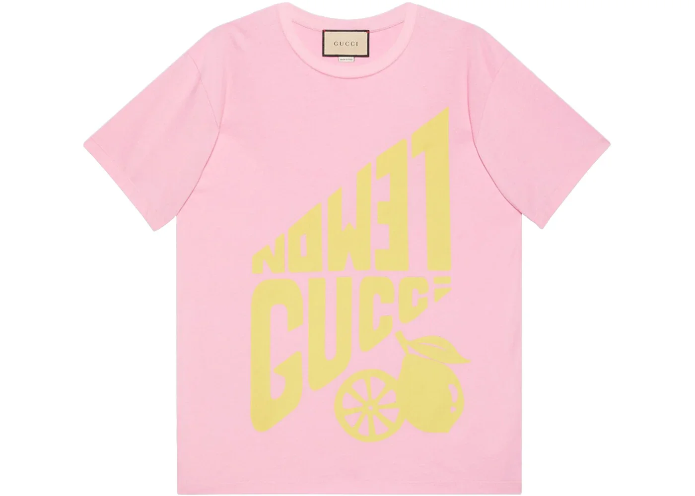 Part of the Gucci references to pop culture, fruits in all shapes and forms continues to enrich the House's narrative. For Aria, they appear as playful prints, often enriching a selection of ready-to-wear pieces. This pink cotton T-shirt is animated by a yellow 'Lemon Gucci' print. - Pink cotton jersey - Yellow 'Lemon Gucci' print - Crewneck - Oversize fit - Length: 28.5", based on a size small - Made in Italy - The model is 5'7" tall. The product shown in this image is a size small
