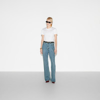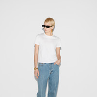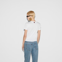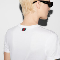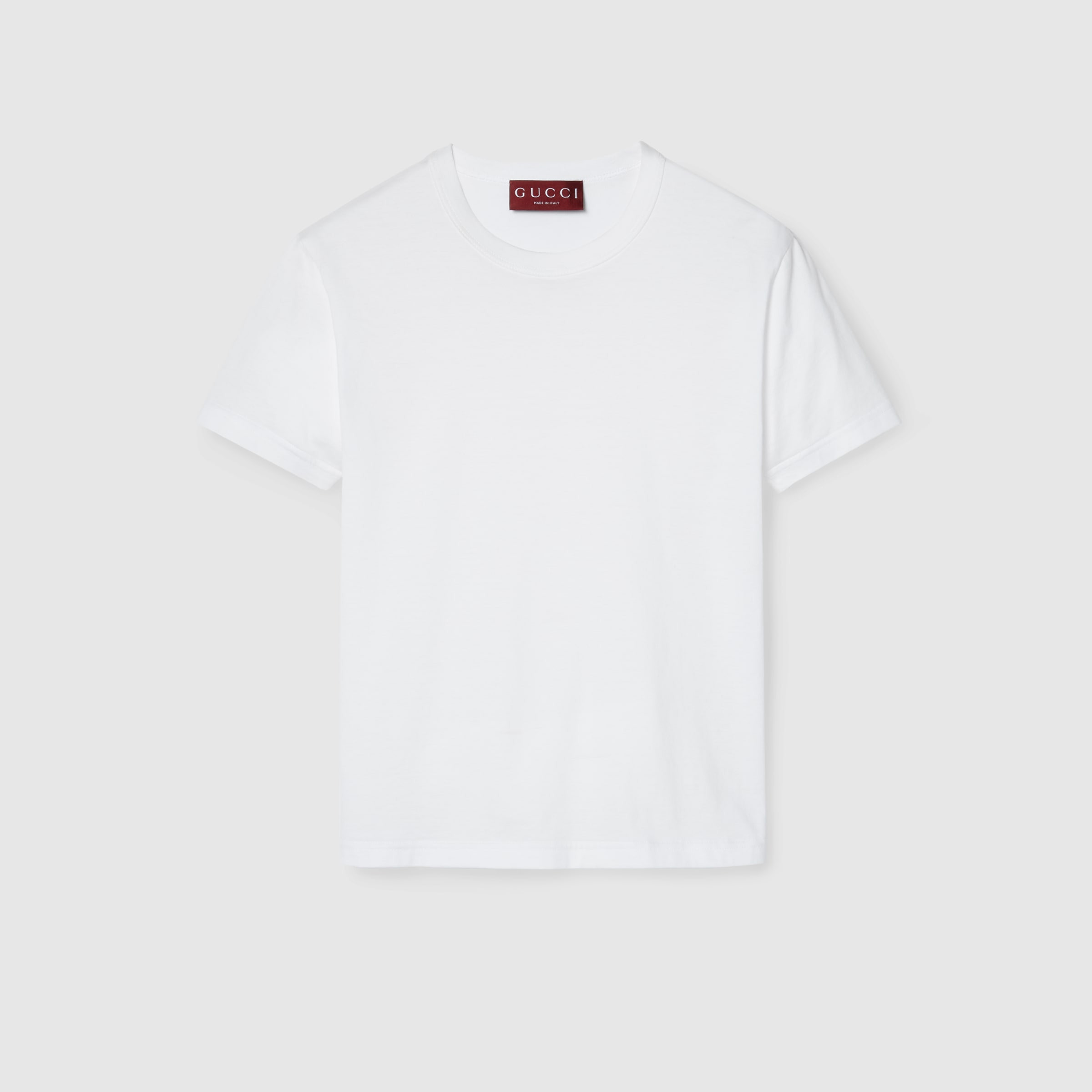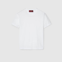 This white light cotton jersey T-shirt had a red and green Web label at the back that adds a pop of color to the essential design. - White light cotton jersey - Green and red Web label at the back - Round neck - Short sleeves - Length: 21.2" ; based on a size small - Made in Italy - The model is 5'9" and is wearing size small
