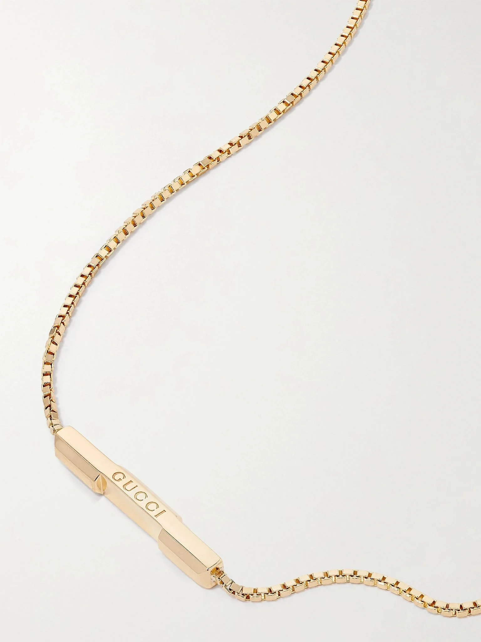Gucci's necklace is part of the label's 'Link to Love' collection, which explores modern romance. It has been made in Italy from polished 18-karat gold and strung with a slim bar etched with the brand's name. The chain is adjustable, so you can wear it shorter or longer, depending on what you're layering it with. Details & Care - Lobster clasp fastening - Comes in a designer-stamped box