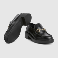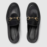 Gucci continues to feature archival symbols. For the latest collection, the Horsebit hardware recalls the House's equestrian heritage. This pair of women's loafers is crafted in leather and defined by a rubber lug sole. - Black leather - Women's - Light gold-toned hardware - Leather lining - Horsebit - Rubber sole - Flat - Height: 1.7" at the back, 0.9" at the front - Made in Italy