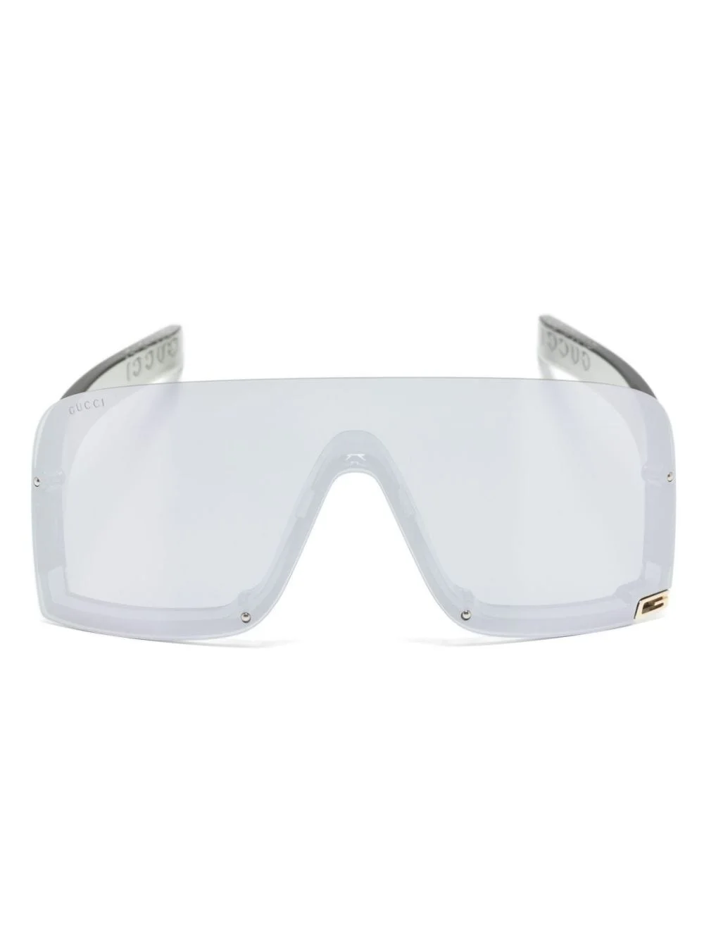 logo-plaque shield-frame sunglasses Gucci eyewear crafts these sunglasses with a mask shape and shiny light grey injection. The silhouette is detailed in a contrasting gold-tone Square G logo at the bottom corner of the left lens. Highlights - Light grey - Acetate - Grey tinted lenses - Shield frame - Gold-tone logo plaque - Logo-embossed arm - Straight arms - These glasses come with a protective case. Made in Italy Composition Acetate 100% SIZE & FIT Measurement Arm Length 4.52 in(11.5 cm) Bridge Width 0.39 in(1 cm) Lens Diameter 3.89 in(9.9 cm) Total Width 5.51 in(14 cm)