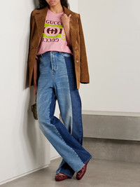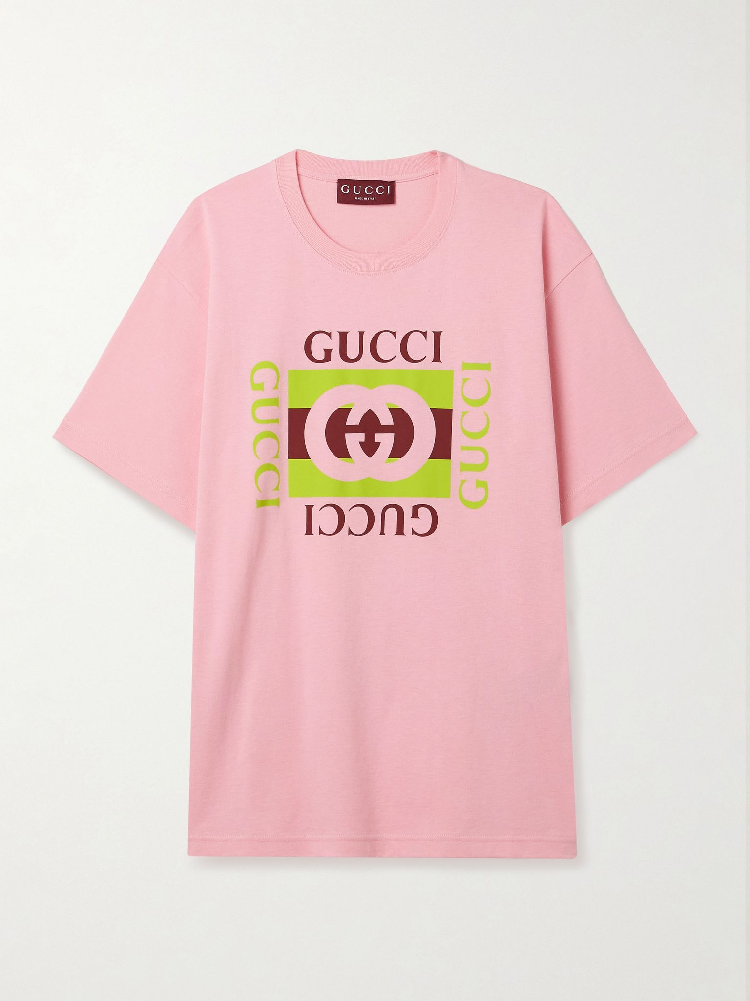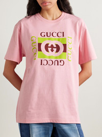 Gucci's T-shirt is printed with a colorful version of the label's logo. It's made from soft cotton-jersey and has an oversized fit. Wear yours with jeans for a classic look. Size & Fit - Intended to be oversized; we recommend sizing down if you prefer a closer fit - Lightweight, slightly stretchy fabric - Model is 175cm/ 5'9" and is wearing a size XSmall Details & Care - Pink cotton-jersey - Slips on - 100% cotton - Machine wash