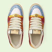The House presents a whimsical collection of ready-to-wear, shoes and accessories in a colorful palette. As a joyful reinterpretation of Gucci’s heritage, hearts and rhombus motifs appear alongside floral accents imbuing the selection with a romantic feel that celebrates love. This women's Screener sneaker appears in multicolored glitter canvas, complete with an orange and beige Web variation. - Multicolor glitter canvas fabric - Women's - Metallic gold leather trim - Orange and beige Web - Oval enameled detail with metal Double G - Label with Gucci vintage logo - Rubber sole - Lace-up closure - Low heel - Made in Italy