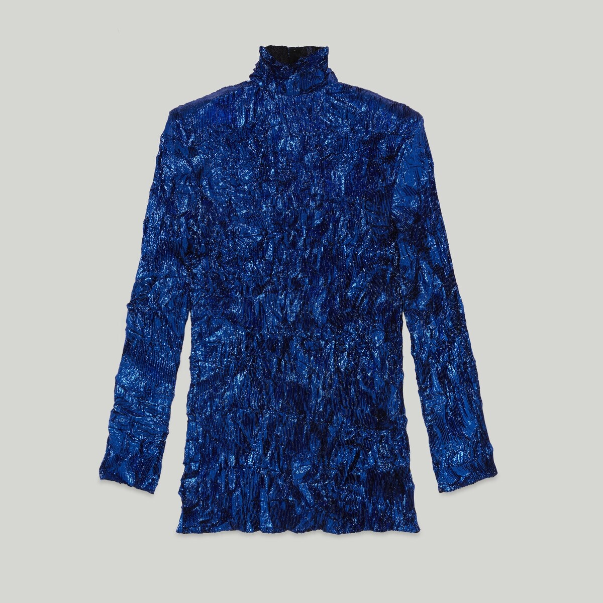 A shiny blue lurex top speaks to the glamorous and elegant side of the Gucci narrative. The silhouette features a high neck, while self-covered buttons add the final touch of sophistication. - Shiny blue lurex - Self-covered buttons - Unlined - High neck - Button closure - Length: 30.7" based on a size 40 (IT) - Made in Italy - The product shown in this image is a size 40 (IT)