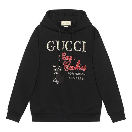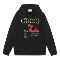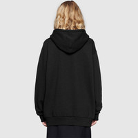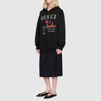 The black cotton sweatshirt features a playful Gucci ‘Mad Cookies’ print, a recurring motif that speaks to the childhood inspired theme seen throughout the Fall Winter 2020 collection. Statement T-shirts and sweatshirts printed with different phrases are essential in Gucci’s collections. - Black heavy felted cotton jersey - Gucci 'Mad Cookies' print - This product contains organic cotton where the cultivation and manufacturing process restrict the use of chemicals, eliminate pesticides or artificial fertilizers and incorporate methods that respect biodiversity, improve soil quality, and reduce water consumption. - Fixed hood - Oversize fit - Length: 30" based on a size medium - 100% cotton - Made in Italy - The product shown in this image is a size medium. The model is 5'7" tall.