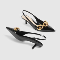 The Marina Chain is a signature design from 1960s, inspired by the glamorous world of yatching. The elegant detail defines here this pair of women's slingback pumps, crafted by shiny patent leather. - Black patent leather - Women's - Gold-toned hardware - Marina chain detail - Pointed toe - Leather sole - Elastic slingback closure - Mid-heel - Height: 1.7" - Made in Italy
