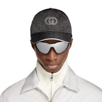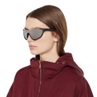 The Pre-Fall 2025 eyewear collection includes mask-shaped sunglasses with innovative shapes and striking color palettes. These mask-shaped sunglasses are presented with injection frames and a mirrored lens, enriched with a Gucci logo and metal end tips. - Matte black injection frame - Matte black injection temples with Gucci logo and metal end tips - Grey mirrored lens - 100% UVA/UVB protection - GG2018S - Temple length: 4.7"; Lens height: 1.8"; Nose bridge length: 0.3" - Frame height 1.9"; Frame width 5.6"; Hinge to hinge 4.7" - Made in Japan - The soft black pouch is complete with an elastic drawstring, the Gucci logo and Interlocking G details.