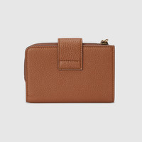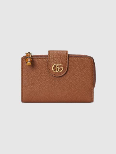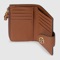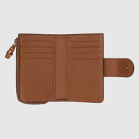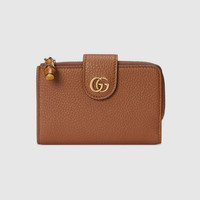 This medium wallet in brown leather features a bamboo zip closure, paying homage to a material at the heart of Gucci’s heritage. Designed with plenty of interior slots and a zip pocket, the accessory is completed by a gold-toned Double G monogram hardware on the snap button closure. - Brown leather - Gold-toned hardware - Moiré lining - Double G - Inside: 8 card slots, 2 bill compartments and 1 zip pocket - Zip closure with bamboo puller - Snap button closure - Open: 6.7"W x 3.3"H - Closed: 5.1"W x 3.3"H x 0.8"D - Made in Italy - Weight: 0.24lbs approximately