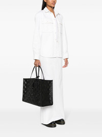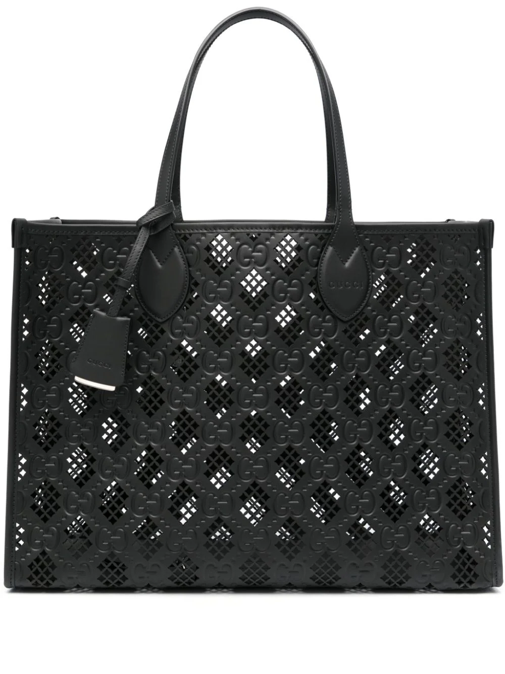Ophidia perforated tote bag For its 2024 Cruise collection, Gucci reimagines the iconic Ophidia bag. This iteration arrives in a black colour and is punctuated with perforated details and the signature GG pattern debossed throughout the leather body. Highlights - Black - Calf leather - Signature debossed gg supreme - Two flat top handles - Perforated design - Logo charm - Main compartment - Removable pouch - Unlined - Open top - This piece comes complete with a protective dust bag. Made in Italy Composition Outer: Calf Leather 100% SIZE & FIT Model measurements Height 5 ft 11 in(1.8 m) Bust/Chest 30.7 in(78 cm) Hips 35.03 in(89 cm) Waist 24.4 in(62 cm) Measurement DEPTH 7.08 in(18 cm) HANDLE 7.48 in(19 cm) HEIGHT 11.81 in(30 cm) WIDTH 16.14 in(41 cm)