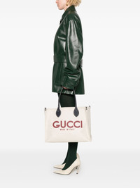 medium Gucci-print tote bag Highlights - Ecru - Canvas - Logo print to the front - Two top handles - Leather trim - Open top - Main compartment - Internal logo patch - Logo-jacquard lining - This piece comes complete with a protective dust bag. Made in Italy Composition Outer: Fabric 100%, Calf Leather 100% SIZE & FIT Model measurements Height 5 ft 9 in(1.75 m) Bust/Chest 34.64 in(88 cm) Hips 36.61 in(93 cm) Waist 26.37 in(67 cm) Measurement DEPTH 6.69 in(17 cm) HEIGHT 11.81 in(30 cm) STRAP 10.62 in(27 cm) WIDTH 16.14 in(41 cm)