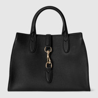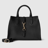 This medium tote design continues to feature the snap hook closure, first introduced in the Spring Summer 2024. The sophisticated leather in black has a distinctive natural grain. The top handle bag's open compartment has a hook closure strap, and comes with a detachable and adjustable shoulder strap. - Black soft grainy leather - Light gold-toned hardware - Unlined - Interior: 2 zip pockets with Gucci crest zip puller - 4.1" handle drop - Detachable and adjustable shoulder strap with 19.7" drop - Hook closure - Medium: 12.2"W x 8.9"H x 3.9"D - Weight: 2.2lbs, approximately - Made in Italy - Fits up to: iPhone Pro Max/Plus, Airpods, long wallet, and lipstick