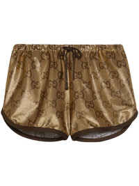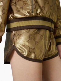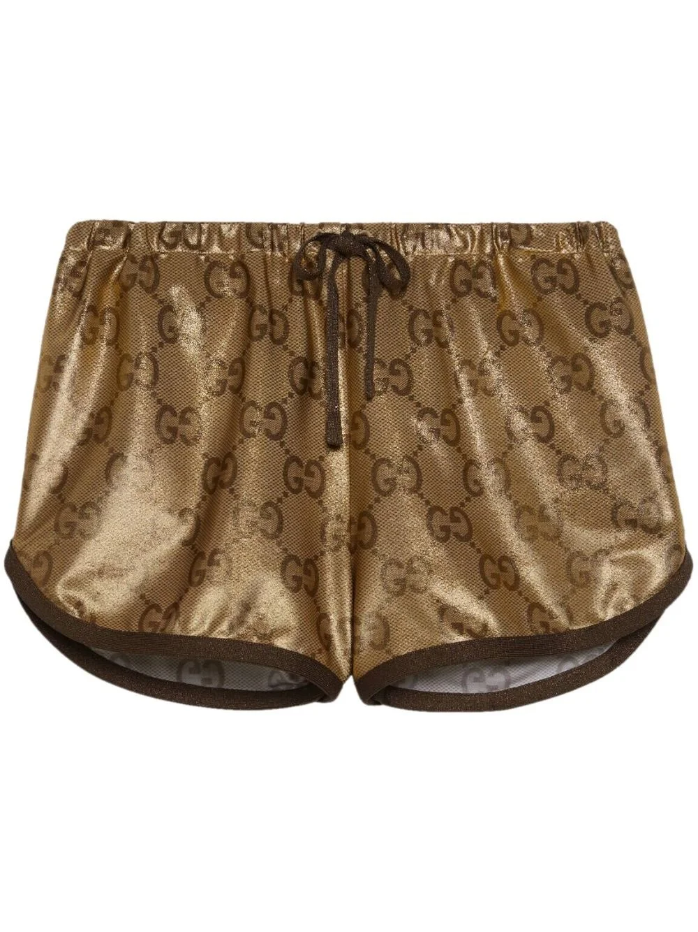 metallic monogram drawstring shorts Highlights - Gold-tone - Jersey knit - Metallic effect - Maxi gg canvas - Contrasting trim - Drawstring waist - Thigh-length Made in Italy Composition Polyamide 80%, Elastane 20% Trims: Viscose 66%, Metallic Fibre 17%, Elastane 2%