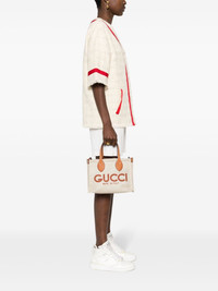 mini logo-print tote bag Highlights - Beige/brown - Cotton - Canvas - Leather trim - Flat top handles - Adjustable detachable shoulder strap - Logo print to the front - Main compartment - Removable pouch - Internal logo tag - Logo-embellished lining - Open top - This piece comes complete with a protective dust bag. Made in Italy Composition Outer: Cotton 100%, Leather 100% SIZE & FIT Model measurements Height 5 ft 11 in(1.8 m) Bust/Chest 32.67 in(83 cm) Hips 36.22 in(92 cm) Waist 24.4 in(62 cm) Measurement DEPTH 4.72 in(12 cm) HANDLE 5.11 in(13 cm) HEIGHT 7.67 in(19.5 cm) WIDTH 11.02 in(28 cm) STRAP 21.65 in(55 cm)