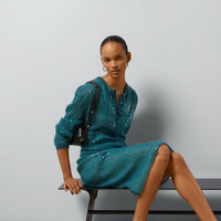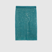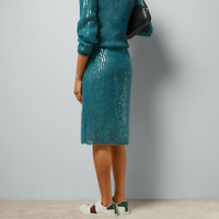 The season's sleek silhouette draws inspirations from the 1990s, with slim-fitting tops and slightly low-slung bottoms. Fine, lightweight knitwear tops fit like second skin, while skirts and pants are worn with relaxed elegance. Crafted from mohair silk, this knit skirt reveals a sparkling sequin embroidery and is completed with an Interlocking G detail. - Teal mohair silk blend - Sequin embroidery - Slip lining - Interlocking G detail - Elastic waist - Length: 25.5", based on a size small - Made in Italy - The product shown in this image is a size small