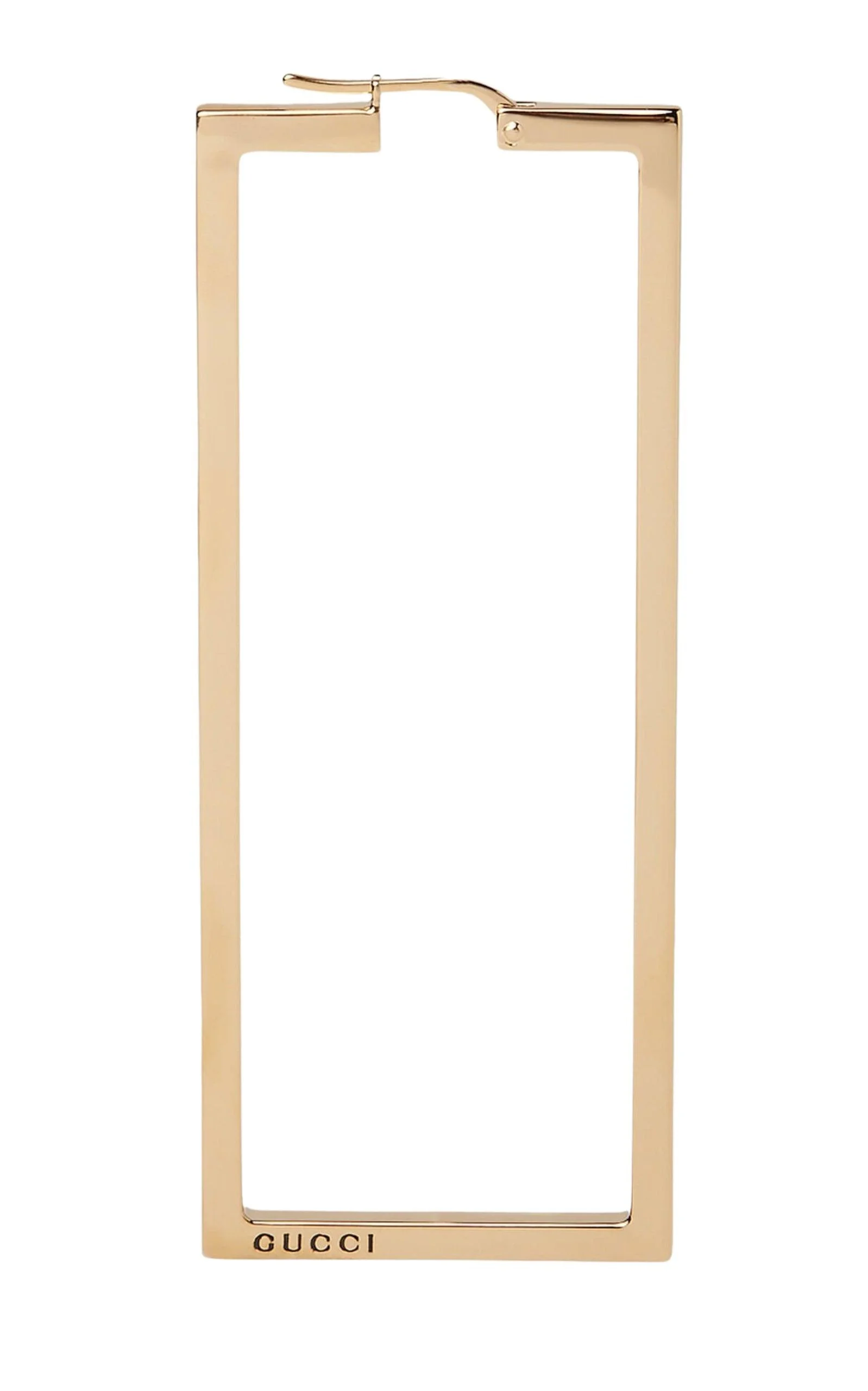 The rectangle earring is crafted from brass in a polished gold-tone finish, featuring a geometric silhouette and logo engraving Single earring Hinge-pin fastening Geometric silhouette Logo engraving Brass Measurements: Height: 3.1 in Color: Gold Made in Italy