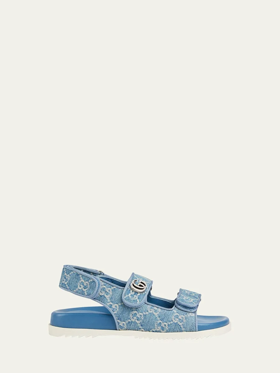 Gucci "Moritz" GG monogram denim easy sandals with leather trim and logo medallion Flat heel Open toe Dual grip strap upper Adjustable grip slingback strap Molded comfort footbed Rubber outsole Made in Italy Online Inquiries: BGS21_X6CT6| Store Inquiries: #4671161