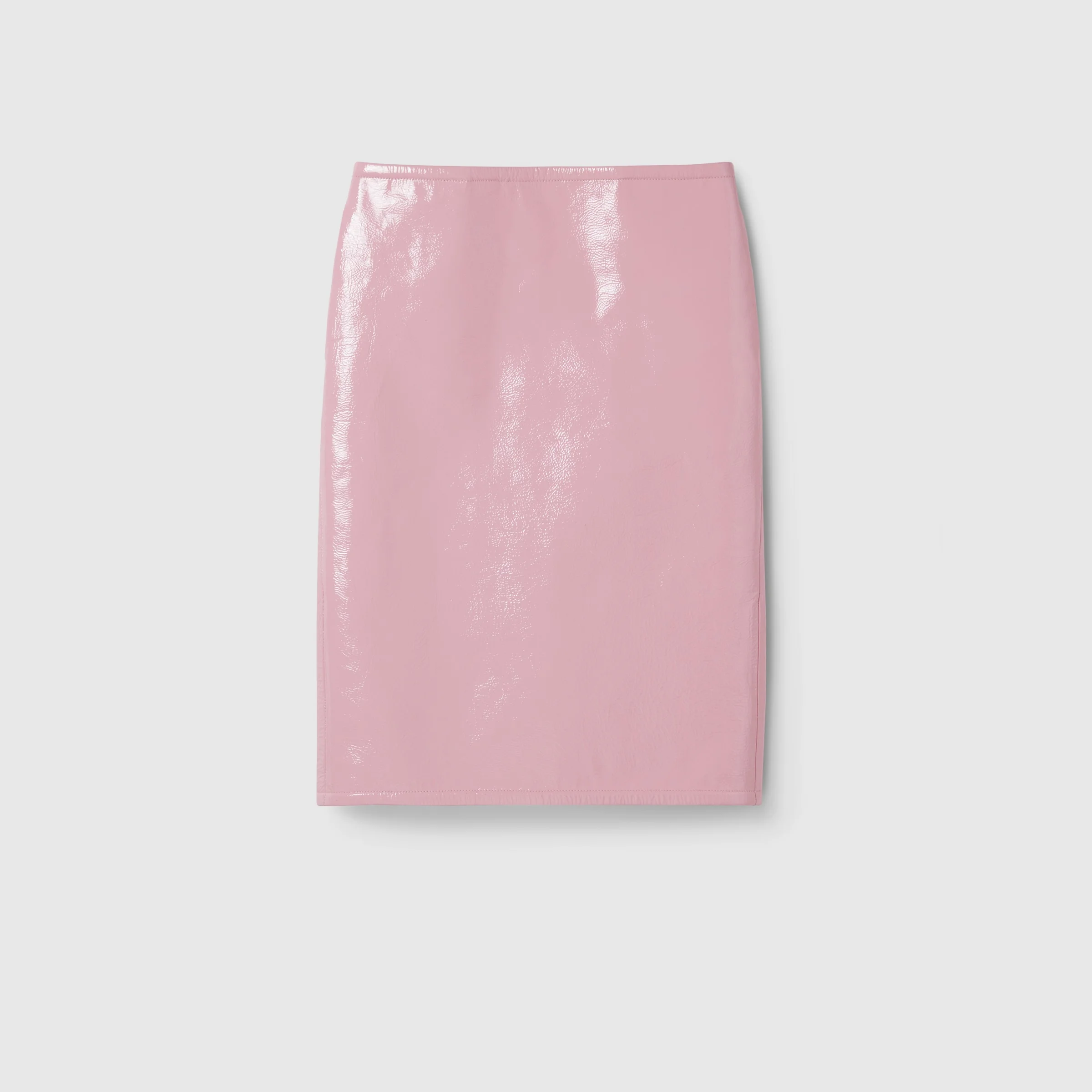 In the Fall Winter 2025 collection, sleek materials and sharp silhouettes define a new take on tailoring. This pencil skirt is crafted in naplak leather and features a back slit and invisible rear zip closure. - Light pink bonded naplak leather - Unlined - Back slit - Invisible back zip closure - Pencil silhouette - Length: 24.8"; based on size 38 IT - Made in Italy
