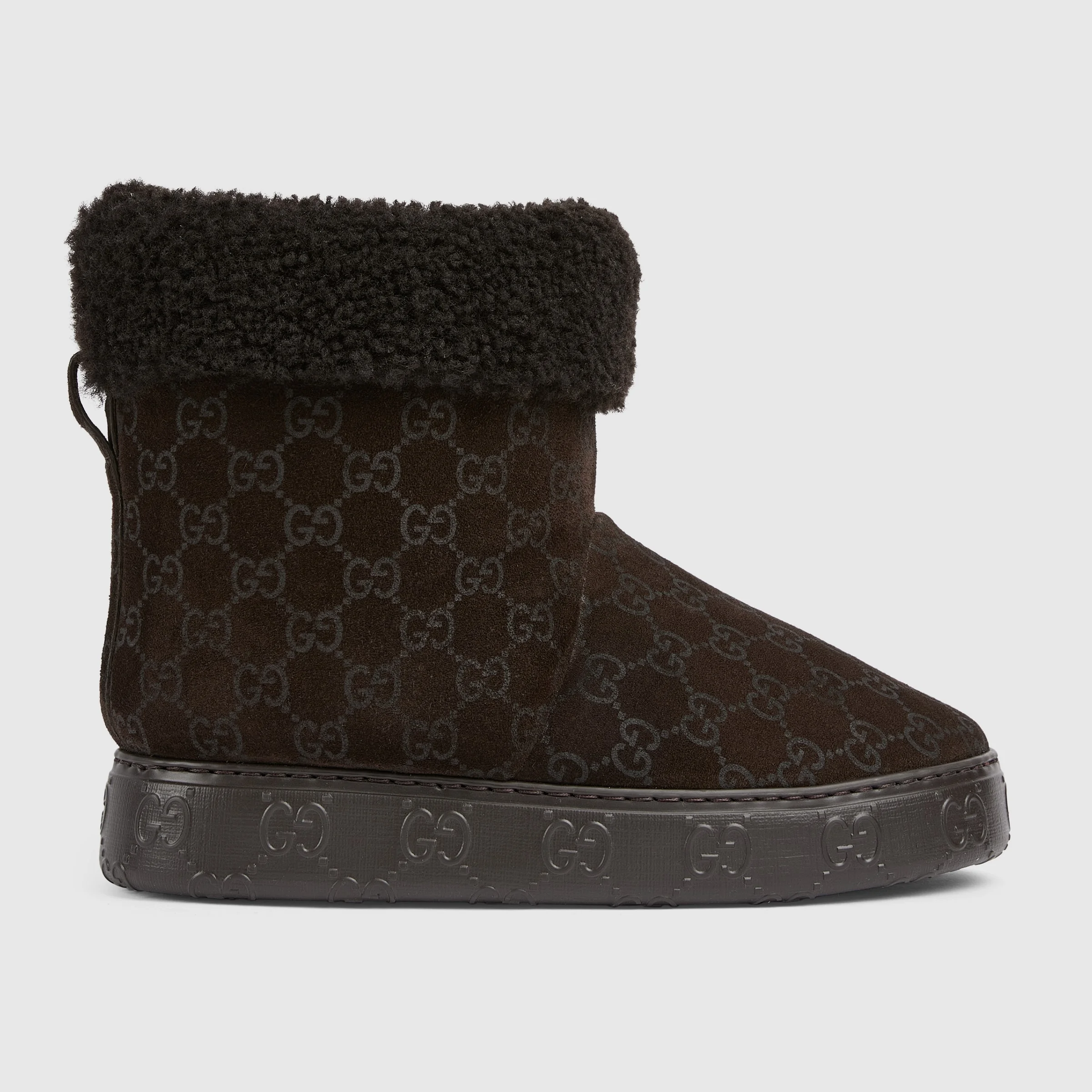 Crafted in suede, this women's boot combines comfort and heritage. The soft merino wool lining offers warmth and luxury, while the distinctive GG rubber sole adds a bold, contemporary twist rooted in the House’s signature monogram. - Dark brown GG suede - Merino wool lining - GG rubber sole - Flat