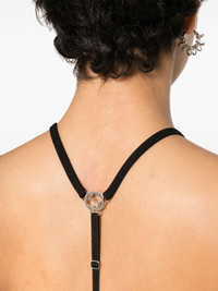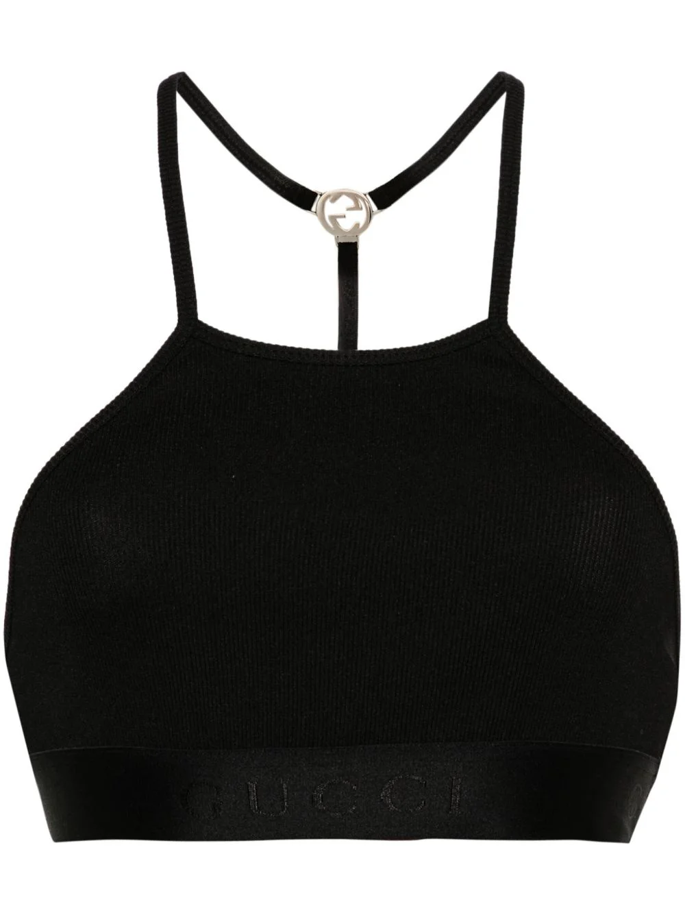Interlocking G ribbed cropped top Drawing inspiration from '90s athleisure, this black Gucci cropped top is cut from ribbed jersey to a sleek racerback silhouette with spaghetti straps anchored by a silver-tone Interlocking G plaque to the rear. Note the logo underband, adding another layer of branding. Highlights - Black - Ribbed knit - Jersey texture - Signature interlocking g logo plaque to the rear - Round neck - Spaghetti straps - Racerback - Cropped elasticated logo underband Made in Italy Composition Polyamide 98%, Elastane 2% SIZE & FIT Model measurements Height 5 ft 9 in(1.76 m) Bust/Chest 31.88 in(81 cm) Hips 35.43 in(90 cm) Waist 24.8 in(63 cm) Measurement LENGTH 12.59 in(32 cm) BUST 26.77 in(68 cm) FittingInformation Designed for a close fit throughout The adjustable shoulder straps allow for a preferred fit when worn Made from a midweight stretch fabric, this piece offers elasticity and flexibility when worn This piece fits true to size – take your usual size Washing instructions Hand Wash