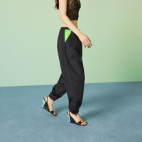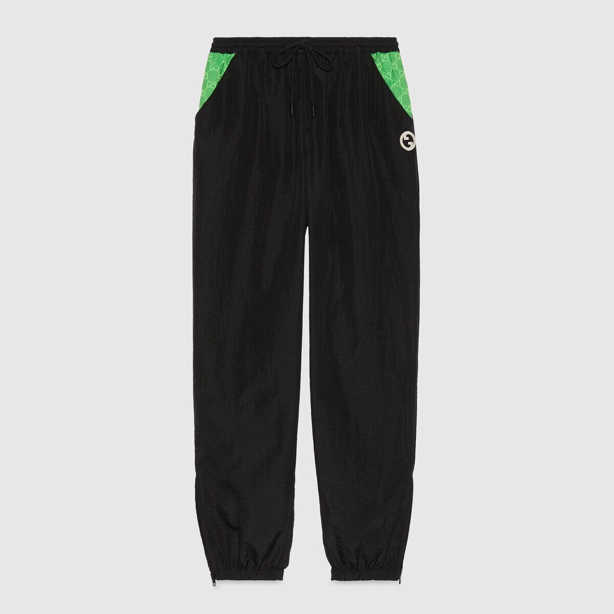 Sporty yet retro, Gucci's interpretation of activewear comes through in its Round Interlocking G logo in the new collection. Here, the subtle motif is presented atop a relaxed jogging pant, further enriched by the contrasting GG cotton canvas inserts across the pockets. - Black nylon - Elastic waist with drawstring closure - Two slash pockets - GG cotton canvas intarsia - Round Interlocking G patch - Elastic leg cuffs with zip - Length: 40.1" based on a size medium - The model is 5'7" and is wearing size medium