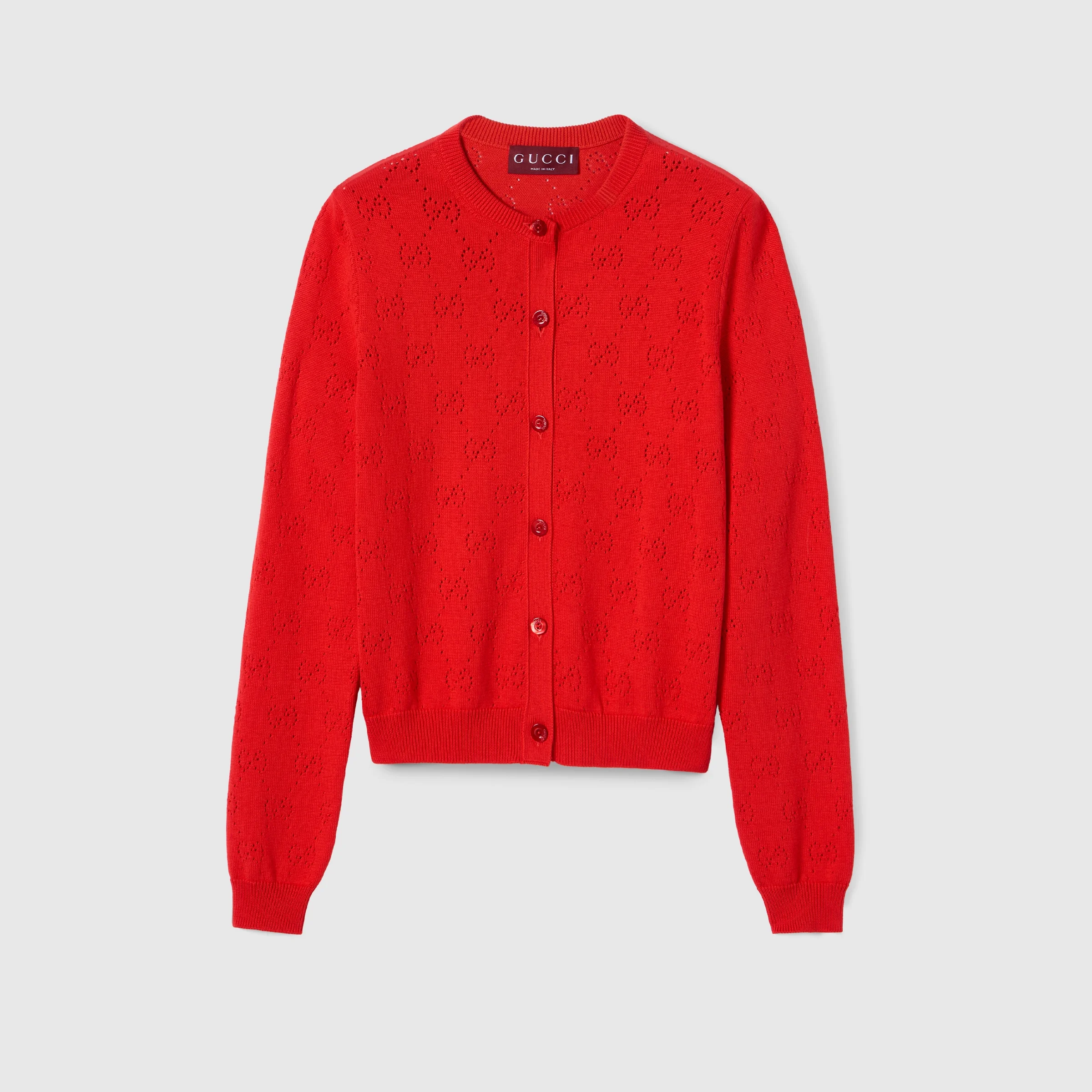 In the Cruise 2026 collection, women's ready-to-wear pieces transition into a new season with bright colors which take center stage across GG motif knitwear. This cardigan is crafted from GG pointelle cotton silk. - Red GG pointelle cotton silk - Rib trim - Crewneck - Long sleeves - Front button closure - Length: 21.6" based on a size S - Made in Italy - Fabric: 55% Silk, 45% Cotton - Details: 54% Silk, 44% Cotton, 1% Elastane, 1% Polyamide