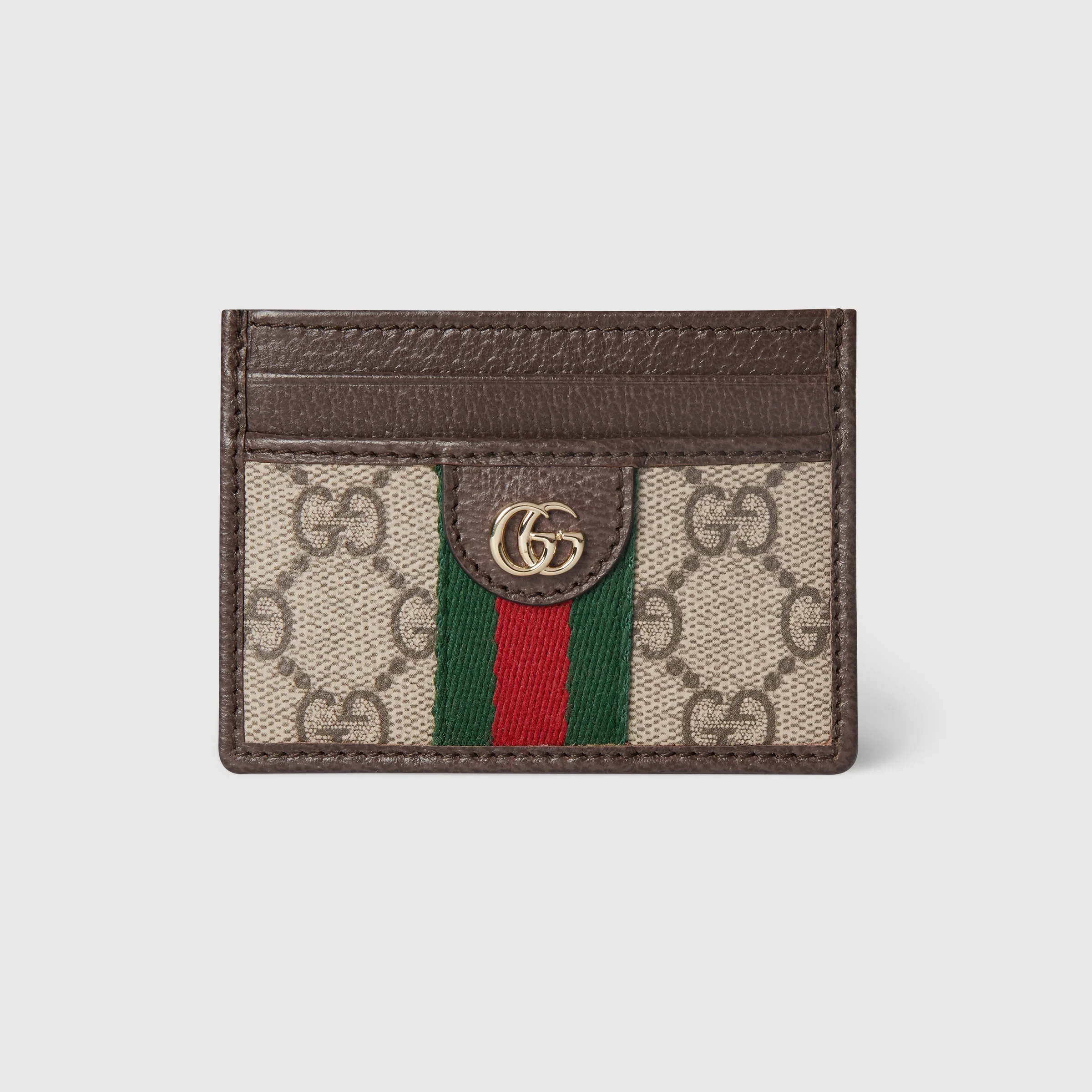 The Ophidia collection highlights reinterpreted silhouettes and functions, crafted with a soft touch in the signature beige and brown palette, such as this card case. - Beige and dark brown soft GG Supreme - Brown leather trim - Light gold-toned hardware - Brown taffeta lining - Double G - Web - Inside: 1 open Compartment, 4 card slots - 3.9"W x 2.8"H - Weight: 2.3oz approximately - Made in Italy