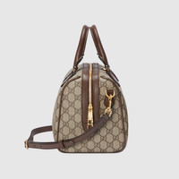 A signature fabric, GG Supreme canvas has become a staple throughout the Gucci universe. Reinterpreted through the Gucci lens, the material appears throughout the latest collections. Here, this medium top handle bag is crafted with the all-over monogram motif. Completing the logo feel, the signature Double G hardware completes the style. - Beige and ebony GG Supreme canvas - Brown leather trim - Gold-toned hardware - Cotton linen lining - Part of the - selection, this product is embedded with NFC technology—an innovative way to authenticate and experience your item digitally. - Double G - Inside: 1 zip pocket - Handle drop: 7.4" - Detachable shoulder strap with 18.8" drop - Zip closure - Medium size: 12.2"W x 7.8"H x 6.4"D