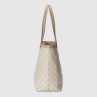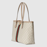 A heritage material from the archive, GG Supreme has been reimagined in Gucci Love Parade in different color combinations and combined with contemporary as well as classic styles. The Ophidia tote is presented in a beige and white variation of the signature material with a tonal trim. Originally a play on a '30s design, the canvas speaks to the historical narrative that runs throughout the collection. - Beige and white GG Supreme canvas - Oatmeal leather trim - Gold-toned hardware - Green and red Web - Cotton linen lining - Double G - Interior zipper pocket - Double leather handles with 10" drop and 21" length - Magnetic snap closure - Weight: .71kg approximately - Medium size: 15"W x 11"H x 5.5"D - Made in Italy - Fits up to: iPhone Pro Max/Plus, Airpods, long wallet, and lipstick