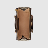 The world of Ophidia evolves with the introduction of a small top handle tote with a detachable shoulder strap. Crafted in GG Supreme canvas with inlaid green and red Web stripe, the accessory is enhanced by a petite play on the Double G, an archival Gucci code from the '70s that appears atop a leather tab detail and on the zipper pull. - Featured in Vogue’s 25 Ways to Gucci - Beige/ebony GG Supreme canvas - Shiny gold-toned hardware - Green and red Web - Double G - Microfiber lining with a suede-like finish - Interior: 1 open pocket - Strap length: 46" - 53.5" - Double leather handles with 2.75" drop - Detachable and adjustable shoulder strap drop: 21.6" - 25.6" - Weight: .4kg approximately - 9.5"W x 8"H x 4.1"D - Made in Italy - The model is 5'10" tall - Fits up to: iPhone Pro Max/Plus, Airpods, small wallet, and lipstick