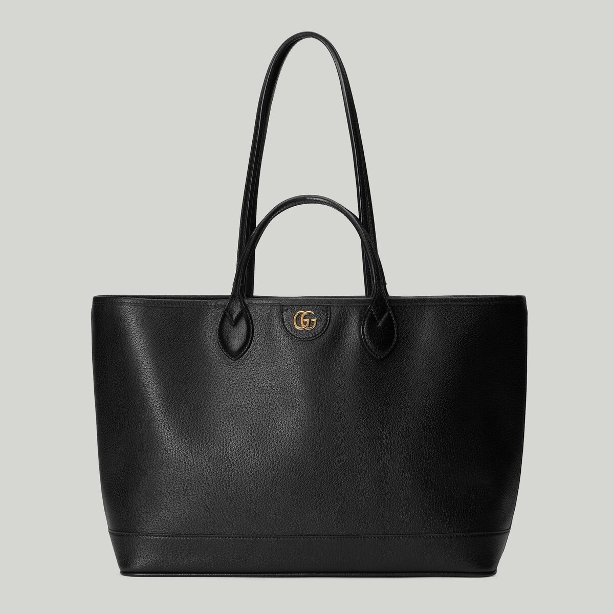 The Ophidia line continues to be one of Gucci signature handbags. New silhouettes are introduced each season, providing versatile accessories to complete any look. Two handles transform this tote bag, allowing it to be styled either as a shoulder bag or top handle. The Double G remains integral to the design, presented across a soft black leather base. - Black leather - Gold-toned hardware - Cotton linen lining - Double G - This item can be used as a shoulder bag or top handle bag - Leather handle with 4.3" drop - Leather shoulder strap with 10.6" drop - Weight: 1.064kg, approximately - Medium size: 15.1"W x 11.2"H x 5.9"D - Made in Italy - The model is 5'8" tall - Fits up to: iPhone Pro Max/Plus, Airpods, long wallet, and lipstick