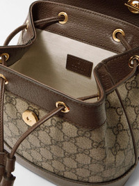 EDITORS'NOTES One look at the all-over monogrammed 'GG' motif and green and red striped webbing and any Gucci fan knows this backpack belongs in the 'Ophidia' family. It's made from coated-canvas, outlined with textured-leather and has a gold-chain top handle that doubles as an embellishment. Inside the canvas-lined interior you'll find plenty of space for your wallet, tablet, water bottle and keys. SIZE & FIT This item’s measurements are: - Handle Drop: 6cm / 2.4in - Depth: 11cm / 4.3in - Height: 20cm / 7.9in - Width: 19cm / 7.5in DETAILS & CARE - Beige and dark-brown coated-canvas, dark-brown leather (Calf), red and green webbing - Chain top handle, adjustable shoulder straps - Canvas lining - Magnetic-fastening front flap - Comes with a dust bag